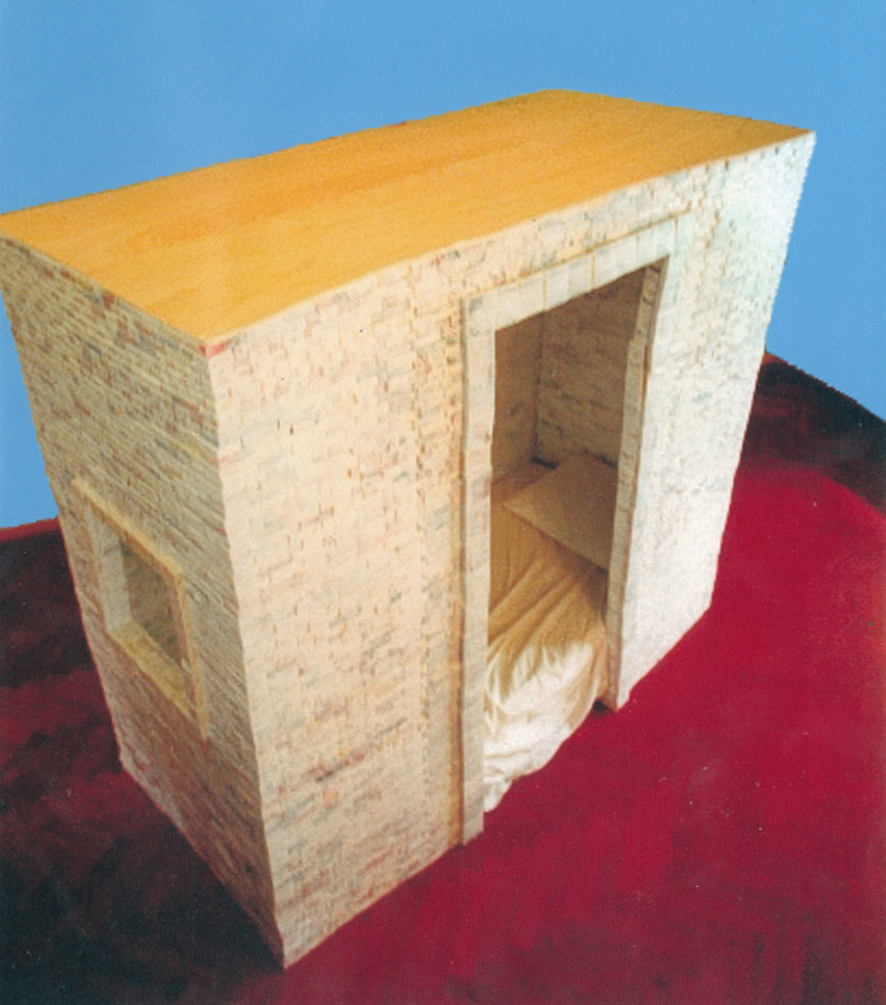 Big House Category : installations, objects Material: cigarette packs, dispersion, plywood board; mattress, pillow, sheet. 200 x 200 x 300 cm.
